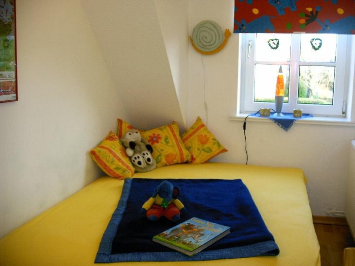 Kinder lieben dieses kleine Zimmer, das farbenfroh und lebendig wirkt. Auf dem 1,40m x 2,00 m breiten Bett (1 Matratze) können 2 kleinere Kinder bequem nebeneinander schlafen. Außerdem gibt es hier einen geräumigen Schrank und einen Nachttisch. Durch das Fenster lacht morgens die Sonne rein. Von hier aus hat man das Geschehen auf dem Kinderspielplatz im Blick und sieht, wenn die Nachbarskinder schon auf sind. Na, dann nichts wie raus aus den Federn...